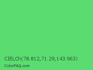 CIELCh 78.812,71.29,143.963 Color is a light green color and the nearest color is Emerald #50c878. Hex code #5bdc71 and RGB value is rgb(91,220,113). In RGB color space, this color is composed of 36% red, 86% green, 44% blue, In CMYK color space, this color is composed of 59% cyan, 0% magenta, 49% yellow , 14% black , In HSL color space, this color has a hue angle of 130° , 65% saturation and 61% lightness.