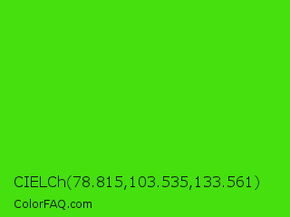 CIELCh 78.815,103.535,133.561 Color is a normal green color and the nearest color is Harlequin Green #46cb18. Hex code #45e00e and RGB value is rgb(69,224,14). In RGB color space, this color is composed of 27% red, 88% green, 5% blue, In CMYK color space, this color is composed of 69% cyan, 0% magenta, 94% yellow , 12% black , In HSL color space, this color has a hue angle of 104° , 88% saturation and 47% lightness.