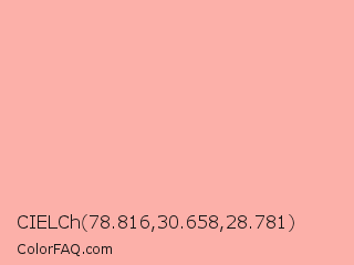 CIELCh 78.816,30.658,28.781 Color is a very light red color and the nearest color is Cornflower Lilac #ffb0ac. Hex code #fcb0a9 and RGB value is rgb(252,176,169). In RGB color space, this color is composed of 99% red, 69% green, 66% blue, In CMYK color space, this color is composed of 0% cyan, 30% magenta, 33% yellow , 1% black , In HSL color space, this color has a hue angle of 5° , 93% saturation and 83% lightness.