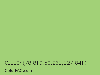 CIELCh 78.819,50.231,127.841 Color is a light green color and the nearest color is Pistachio #93c572. Hex code #a2d177 and RGB value is rgb(162,209,119). In RGB color space, this color is composed of 64% red, 82% green, 47% blue, In CMYK color space, this color is composed of 22% cyan, 0% magenta, 43% yellow , 18% black , In HSL color space, this color has a hue angle of 91° , 49% saturation and 64% lightness.