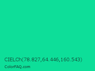 CIELCh 78.827,64.446,160.543 Color is a normal green color and the nearest color is Caribbean Green #00cc99. Hex code #0dde99 and RGB value is rgb(13,222,153). In RGB color space, this color is composed of 5% red, 87% green, 60% blue, In CMYK color space, this color is composed of 94% cyan, 0% magenta, 31% yellow , 13% black , In HSL color space, this color has a hue angle of 160° , 89% saturation and 46% lightness.