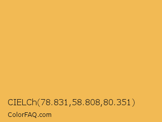 CIELCh 78.831,58.808,80.351 Color is a light orange color and the nearest color is Casablanca #f8b853. Hex code #f2ba54 and RGB value is rgb(242,186,84). In RGB color space, this color is composed of 95% red, 73% green, 33% blue, In CMYK color space, this color is composed of 0% cyan, 23% magenta, 65% yellow , 5% black , In HSL color space, this color has a hue angle of 39° , 86% saturation and 64% lightness.