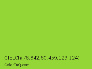 CIELCh 78.842,80.459,123.124 Color is a normal green color and the nearest color is Yellow Green #9acd32. Hex code #94d636 and RGB value is rgb(148,214,54). In RGB color space, this color is composed of 58% red, 84% green, 21% blue, In CMYK color space, this color is composed of 31% cyan, 0% magenta, 75% yellow , 16% black , In HSL color space, this color has a hue angle of 85° , 66% saturation and 53% lightness.