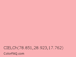 CIELCh 78.851,28.923,17.762 Color is a very light red color and the nearest color is Sundown #ffb1b3. Hex code #fab0b4 and RGB value is rgb(250,176,180). In RGB color space, this color is composed of 98% red, 69% green, 71% blue, In CMYK color space, this color is composed of 0% cyan, 30% magenta, 28% yellow , 2% black , In HSL color space, this color has a hue angle of 357° , 88% saturation and 84% lightness.