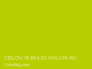 CIELCh 78.864,83.604,109.96 Color is a normal yellow color and the nearest color is Rio Grande #bbd009. Hex code #b7cf00 and RGB value is rgb(183,207,0). In RGB color space, this color is composed of 72% red, 81% green, 0% blue, In CMYK color space, this color is composed of 12% cyan, 0% magenta, 100% yellow , 19% black , In HSL color space, this color has a hue angle of 67° , 100% saturation and 41% lightness.