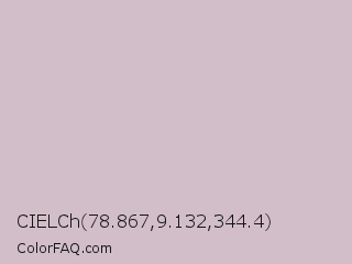 CIELCh 78.867,9.132,344.4 Color is a light rose color and the nearest color is Maverick #d8c2d5. Hex code #d2bec8 and RGB value is rgb(210,190,200). In RGB color space, this color is composed of 82% red, 75% green, 78% blue, In CMYK color space, this color is composed of 0% cyan, 10% magenta, 5% yellow , 18% black , In HSL color space, this color has a hue angle of 330° , 18% saturation and 78% lightness.