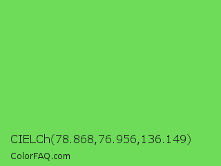 CIELCh 78.868,76.956,136.149 Color is a normal green color and the nearest color is Mantis #74c365. Hex code #6edb59 and RGB value is rgb(110,219,89). In RGB color space, this color is composed of 43% red, 86% green, 35% blue, In CMYK color space, this color is composed of 50% cyan, 0% magenta, 59% yellow , 14% black , In HSL color space, this color has a hue angle of 110° , 64% saturation and 60% lightness.