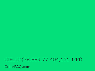 CIELCh 78.889,77.404,151.144 Color is a normal green color and the nearest color is Spring Green #00ff7f. Hex code #03e07a and RGB value is rgb(3,224,122). In RGB color space, this color is composed of 1% red, 88% green, 48% blue, In CMYK color space, this color is composed of 99% cyan, 0% magenta, 46% yellow , 12% black , In HSL color space, this color has a hue angle of 152° , 97% saturation and 45% lightness.