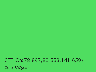 CIELCh 78.897,80.553,141.659 Color is a normal green color and the nearest color is UFO Green #3cd070. Hex code #4fde60 and RGB value is rgb(79,222,96). In RGB color space, this color is composed of 31% red, 87% green, 38% blue, In CMYK color space, this color is composed of 64% cyan, 0% magenta, 57% yellow , 13% black , In HSL color space, this color has a hue angle of 127° , 68% saturation and 59% lightness.