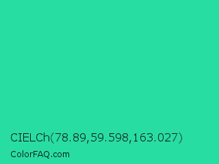 CIELCh 78.89,59.598,163.027 Color is a normal green color and the nearest color is Shamrock #33cc99. Hex code #28dda1 and RGB value is rgb(40,221,161). In RGB color space, this color is composed of 16% red, 87% green, 63% blue, In CMYK color space, this color is composed of 82% cyan, 0% magenta, 27% yellow , 13% black , In HSL color space, this color has a hue angle of 160° , 73% saturation and 51% lightness.
