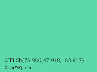 CIELCh 78.906,47.918,163.817 Color is a light green color and the nearest color is Medium Aquamarine #66ddaa. Hex code #5cd9a9 and RGB value is rgb(92,217,169). In RGB color space, this color is composed of 36% red, 85% green, 66% blue, In CMYK color space, this color is composed of 58% cyan, 0% magenta, 22% yellow , 15% black , In HSL color space, this color has a hue angle of 157° , 62% saturation and 61% lightness.