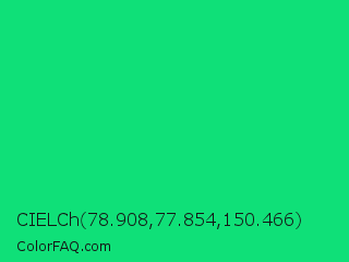 CIELCh 78.908,77.854,150.466 Color is a normal green color and the nearest color is Spring Green #00ff7f. Hex code #0fe078 and RGB value is rgb(15,224,120). In RGB color space, this color is composed of 6% red, 88% green, 47% blue, In CMYK color space, this color is composed of 93% cyan, 0% magenta, 46% yellow , 12% black , In HSL color space, this color has a hue angle of 150° , 87% saturation and 47% lightness.