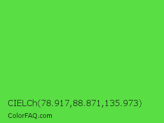 CIELCh 78.917,88.871,135.973 Color is a normal green color and the nearest color is Lime Green #32cd32. Hex code #59de44 and RGB value is rgb(89,222,68). In RGB color space, this color is composed of 35% red, 87% green, 27% blue, In CMYK color space, this color is composed of 60% cyan, 0% magenta, 69% yellow , 13% black , In HSL color space, this color has a hue angle of 112° , 70% saturation and 57% lightness.