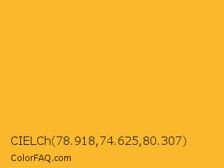 CIELCh 78.918,74.625,80.307 Color is a normal orange color and the nearest color is Saffron #f4c430. Hex code #fab82c and RGB value is rgb(250,184,44). In RGB color space, this color is composed of 98% red, 72% green, 17% blue, In CMYK color space, this color is composed of 0% cyan, 26% magenta, 82% yellow , 2% black , In HSL color space, this color has a hue angle of 41° , 95% saturation and 58% lightness.