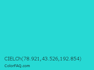 CIELCh 78.921,43.526,192.854 Color is a normal cyan color and the nearest color is Turquoise PWG #30d5c8. Hex code #26d9d4 and RGB value is rgb(38,217,212). In RGB color space, this color is composed of 15% red, 85% green, 83% blue, In CMYK color space, this color is composed of 82% cyan, 0% magenta, 2% yellow , 15% black , In HSL color space, this color has a hue angle of 178° , 70% saturation and 50% lightness.