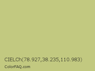 CIELCh 78.927,38.235,110.983 Color is a light yellow color and the nearest color is Pine Glade #c7cd90. Hex code #c2c980 and RGB value is rgb(194,201,128). In RGB color space, this color is composed of 76% red, 79% green, 50% blue, In CMYK color space, this color is composed of 3% cyan, 0% magenta, 36% yellow , 21% black , In HSL color space, this color has a hue angle of 66° , 40% saturation and 65% lightness.