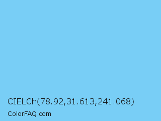 CIELCh 78.92,31.613,241.068 Color is a light blue color and the nearest color is Malibu #7dc8f7. Hex code #78cef6 and RGB value is rgb(120,206,246). In RGB color space, this color is composed of 47% red, 81% green, 96% blue, In CMYK color space, this color is composed of 51% cyan, 16% magenta, 0% yellow , 4% black , In HSL color space, this color has a hue angle of 199° , 88% saturation and 72% lightness.