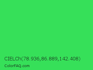 CIELCh 78.936,86.889,142.408 Color is a normal green color and the nearest color is UFO Green #3cd070. Hex code #36e059 and RGB value is rgb(54,224,89). In RGB color space, this color is composed of 21% red, 88% green, 35% blue, In CMYK color space, this color is composed of 76% cyan, 0% magenta, 60% yellow , 12% black , In HSL color space, this color has a hue angle of 132° , 73% saturation and 55% lightness.