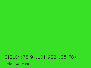 CIELCh 78.94,101.922,135.78 Color is a normal green color and the nearest color is Lime Green #32cd32. Hex code #38e125 and RGB value is rgb(56,225,37). In RGB color space, this color is composed of 22% red, 88% green, 15% blue, In CMYK color space, this color is composed of 75% cyan, 0% magenta, 84% yellow , 12% black , In HSL color space, this color has a hue angle of 114° , 76% saturation and 51% lightness.