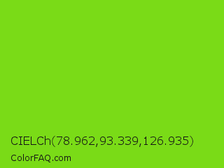 CIELCh 78.962,93.339,126.935 Color is a normal green color and the nearest color is Alien Armpit #84de02. Hex code #7adb17 and RGB value is rgb(122,219,23). In RGB color space, this color is composed of 48% red, 86% green, 9% blue, In CMYK color space, this color is composed of 44% cyan, 0% magenta, 89% yellow , 14% black , In HSL color space, this color has a hue angle of 90° , 81% saturation and 47% lightness.