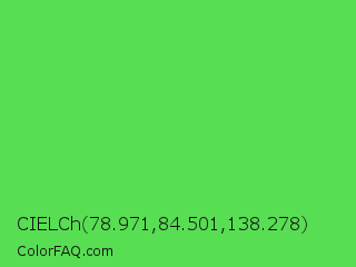 CIELCh 78.971,84.501,138.278 Color is a normal green color and the nearest color is Screamin Green #66ff66. Hex code #57de52 and RGB value is rgb(87,222,82). In RGB color space, this color is composed of 34% red, 87% green, 32% blue, In CMYK color space, this color is composed of 61% cyan, 0% magenta, 63% yellow , 13% black , In HSL color space, this color has a hue angle of 118° , 68% saturation and 60% lightness.