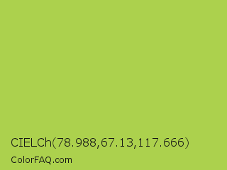 CIELCh 78.988,67.13,117.666 Color is a normal lime color and the nearest color is Conifer #acdd4d. Hex code #acd14d and RGB value is rgb(172,209,77). In RGB color space, this color is composed of 67% red, 82% green, 30% blue, In CMYK color space, this color is composed of 18% cyan, 0% magenta, 63% yellow , 18% black , In HSL color space, this color has a hue angle of 77° , 59% saturation and 56% lightness.