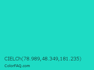 CIELCh 78.989,48.349,181.235 Color is a normal cyan color and the nearest color is Turquoise PWG #30d5c8. Hex code #1ddbc4 and RGB value is rgb(29,219,196). In RGB color space, this color is composed of 11% red, 86% green, 77% blue, In CMYK color space, this color is composed of 87% cyan, 0% magenta, 11% yellow , 14% black , In HSL color space, this color has a hue angle of 173° , 77% saturation and 49% lightness.