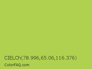 CIELCh 78.996,65.06,116.376 Color is a normal lime color and the nearest color is Conifer #acdd4d. Hex code #b0d050 and RGB value is rgb(176,208,80). In RGB color space, this color is composed of 69% red, 82% green, 31% blue, In CMYK color space, this color is composed of 15% cyan, 0% magenta, 62% yellow , 18% black , In HSL color space, this color has a hue angle of 75° , 58% saturation and 56% lightness.