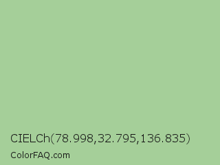CIELCh 78.998,32.795,136.835 Color is a light green color and the nearest color is Eton Blue #96c8a2. Hex code #a5cf99 and RGB value is rgb(165,207,153). In RGB color space, this color is composed of 65% red, 81% green, 60% blue, In CMYK color space, this color is composed of 20% cyan, 0% magenta, 26% yellow , 19% black , In HSL color space, this color has a hue angle of 107° , 36% saturation and 71% lightness.