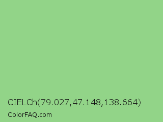 CIELCh 79.027,47.148,138.664 Color is a light green color and the nearest color is Feijoa #9fdd8c. Hex code #92d488 and RGB value is rgb(146,212,136). In RGB color space, this color is composed of 57% red, 83% green, 53% blue, In CMYK color space, this color is composed of 31% cyan, 0% magenta, 36% yellow , 17% black , In HSL color space, this color has a hue angle of 112° , 47% saturation and 68% lightness.