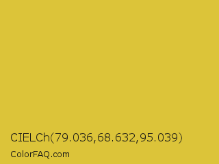 CIELCh 79.036,68.632,95.039 Color is a normal yellow color and the nearest color is Meat Brown #e5b73b. Hex code #dcc439 and RGB value is rgb(220,196,57). In RGB color space, this color is composed of 86% red, 77% green, 22% blue, In CMYK color space, this color is composed of 0% cyan, 11% magenta, 74% yellow , 14% black , In HSL color space, this color has a hue angle of 51° , 70% saturation and 54% lightness.