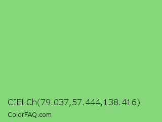CIELCh 79.037,57.444,138.416 Color is a light green color and the nearest color is Pastel Green #77dd77. Hex code #85d77a and RGB value is rgb(133,215,122). In RGB color space, this color is composed of 52% red, 84% green, 48% blue, In CMYK color space, this color is composed of 38% cyan, 0% magenta, 43% yellow , 16% black , In HSL color space, this color has a hue angle of 113° , 54% saturation and 66% lightness.