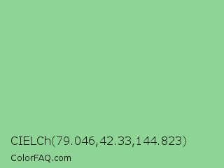 CIELCh 79.046,42.33,144.823 Color is a light green color and the nearest color is Granny Smith Apple Crayola #9de093. Hex code #8ed495 and RGB value is rgb(142,212,149). In RGB color space, this color is composed of 56% red, 83% green, 58% blue, In CMYK color space, this color is composed of 33% cyan, 0% magenta, 30% yellow , 17% black , In HSL color space, this color has a hue angle of 126° , 45% saturation and 69% lightness.