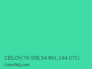 CIELCh 79.058,54.861,164.071 Color is a normal green color and the nearest color is Eucalyptus #44d7a8. Hex code #40dca6 and RGB value is rgb(64,220,166). In RGB color space, this color is composed of 25% red, 86% green, 65% blue, In CMYK color space, this color is composed of 71% cyan, 0% magenta, 25% yellow , 14% black , In HSL color space, this color has a hue angle of 159° , 69% saturation and 56% lightness.