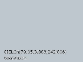 CIELCh 79.05,3.888,242.806 Color is a light blue color and the nearest color is Submarine #bac7c9. Hex code #bdc5ca and RGB value is rgb(189,197,202). In RGB color space, this color is composed of 74% red, 77% green, 79% blue, In CMYK color space, this color is composed of 6% cyan, 2% magenta, 0% yellow , 21% black , In HSL color space, this color has a hue angle of 203° , 11% saturation and 77% lightness.