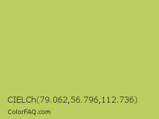 CIELCh 79.062,56.796,112.736 Color is a normal yellow color and the nearest color is Celery #b8c25d. Hex code #bbcd5e and RGB value is rgb(187,205,94). In RGB color space, this color is composed of 73% red, 80% green, 37% blue, In CMYK color space, this color is composed of 9% cyan, 0% magenta, 54% yellow , 20% black , In HSL color space, this color has a hue angle of 70° , 53% saturation and 59% lightness.