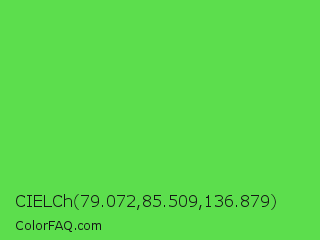 CIELCh 79.072,85.509,136.879 Color is a normal green color and the nearest color is Screamin Green #66ff66. Hex code #5cde4d and RGB value is rgb(92,222,77). In RGB color space, this color is composed of 36% red, 87% green, 30% blue, In CMYK color space, this color is composed of 59% cyan, 0% magenta, 65% yellow , 13% black , In HSL color space, this color has a hue angle of 114° , 69% saturation and 59% lightness.