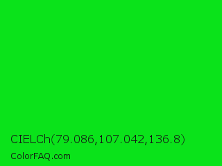 CIELCh 79.086,107.042,136.8 Color is a normal green color and the nearest color is Vivid Malachite #00cc33. Hex code #0ae31a and RGB value is rgb(10,227,26). In RGB color space, this color is composed of 4% red, 89% green, 10% blue, In CMYK color space, this color is composed of 96% cyan, 0% magenta, 89% yellow , 11% black , In HSL color space, this color has a hue angle of 124° , 92% saturation and 46% lightness.
