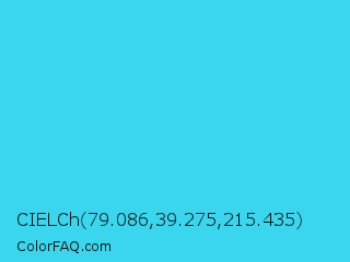 CIELCh 79.086,39.275,215.435 Color is a normal cyan color and the nearest color is Turquoise #40e0d0. Hex code #39d6ed and RGB value is rgb(57,214,237). In RGB color space, this color is composed of 22% red, 84% green, 93% blue, In CMYK color space, this color is composed of 76% cyan, 10% magenta, 0% yellow , 7% black , In HSL color space, this color has a hue angle of 188° , 83% saturation and 58% lightness.