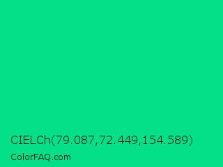 CIELCh 79.087,72.449,154.589 Color is a normal green color and the nearest color is Caribbean Green #00cc99. Hex code #03e087 and RGB value is rgb(3,224,135). In RGB color space, this color is composed of 1% red, 88% green, 53% blue, In CMYK color space, this color is composed of 99% cyan, 0% magenta, 40% yellow , 12% black , In HSL color space, this color has a hue angle of 156° , 97% saturation and 45% lightness.