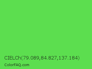 CIELCh 79.089,84.827,137.184 Color is a normal green color and the nearest color is Screamin Green #66ff66. Hex code #5cde4f and RGB value is rgb(92,222,79). In RGB color space, this color is composed of 36% red, 87% green, 31% blue, In CMYK color space, this color is composed of 59% cyan, 0% magenta, 64% yellow , 13% black , In HSL color space, this color has a hue angle of 115° , 68% saturation and 59% lightness.