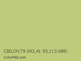 CIELCh 79.093,41.93,113.688 Color is a light yellow color and the nearest color is Wild Willow #b9c46a. Hex code #becb7b and RGB value is rgb(190,203,123). In RGB color space, this color is composed of 75% red, 80% green, 48% blue, In CMYK color space, this color is composed of 6% cyan, 0% magenta, 39% yellow , 20% black , In HSL color space, this color has a hue angle of 70° , 43% saturation and 64% lightness.