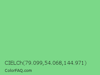 CIELCh 79.099,54.068,144.971 Color is a light green color and the nearest color is Pastel Green #77dd77. Hex code #7bd888 and RGB value is rgb(123,216,136). In RGB color space, this color is composed of 48% red, 85% green, 53% blue, In CMYK color space, this color is composed of 43% cyan, 0% magenta, 37% yellow , 15% black , In HSL color space, this color has a hue angle of 128° , 54% saturation and 66% lightness.