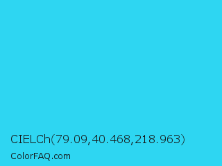 CIELCh 79.09,40.468,218.963 Color is a normal cyan color and the nearest color is Scooter #2ebfd4. Hex code #2ed6f2 and RGB value is rgb(46,214,242). In RGB color space, this color is composed of 18% red, 84% green, 95% blue, In CMYK color space, this color is composed of 81% cyan, 12% magenta, 0% yellow , 5% black , In HSL color space, this color has a hue angle of 189° , 88% saturation and 56% lightness.