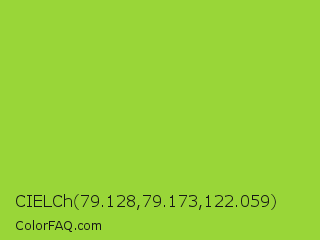 CIELCh 79.128,79.173,122.059 Color is a normal green color and the nearest color is Yellow Green #9acd32. Hex code #99d638 and RGB value is rgb(153,214,56). In RGB color space, this color is composed of 60% red, 84% green, 22% blue, In CMYK color space, this color is composed of 29% cyan, 0% magenta, 74% yellow , 16% black , In HSL color space, this color has a hue angle of 83° , 66% saturation and 53% lightness.