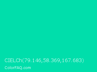 CIELCh 79.146,58.369,167.683 Color is a normal cyan color and the nearest color is Caribbean Green #00cc99. Hex code #00deab and RGB value is rgb(0,222,171). In RGB color space, this color is composed of 0% red, 87% green, 67% blue, In CMYK color space, this color is composed of 100% cyan, 0% magenta, 23% yellow , 13% black , In HSL color space, this color has a hue angle of 166° , 100% saturation and 44% lightness.