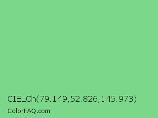 CIELCh 79.149,52.826,145.973 Color is a light green color and the nearest color is De York #7ac488. Hex code #7bd88b and RGB value is rgb(123,216,139). In RGB color space, this color is composed of 48% red, 85% green, 55% blue, In CMYK color space, this color is composed of 43% cyan, 0% magenta, 36% yellow , 15% black , In HSL color space, this color has a hue angle of 130° , 54% saturation and 66% lightness.