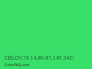 CIELCh 79.14,80.87,145.342 Color is a normal green color and the nearest color is UFO Green #3cd070. Hex code #38e069 and RGB value is rgb(56,224,105). In RGB color space, this color is composed of 22% red, 88% green, 41% blue, In CMYK color space, this color is composed of 75% cyan, 0% magenta, 53% yellow , 12% black , In HSL color space, this color has a hue angle of 138° , 73% saturation and 55% lightness.