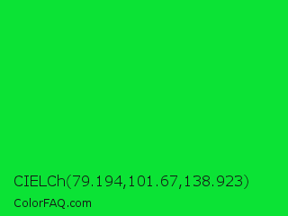 CIELCh 79.194,101.67,138.923 Color is a normal green color and the nearest color is Vivid Malachite #00cc33. Hex code #0be335 and RGB value is rgb(11,227,53). In RGB color space, this color is composed of 4% red, 89% green, 21% blue, In CMYK color space, this color is composed of 95% cyan, 0% magenta, 77% yellow , 11% black , In HSL color space, this color has a hue angle of 132° , 91% saturation and 47% lightness.
