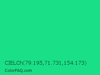 CIELCh 79.195,71.731,154.173 Color is a normal green color and the nearest color is Caribbean Green #00cc99. Hex code #19e087 and RGB value is rgb(25,224,135). In RGB color space, this color is composed of 10% red, 88% green, 53% blue, In CMYK color space, this color is composed of 89% cyan, 0% magenta, 40% yellow , 12% black , In HSL color space, this color has a hue angle of 153° , 80% saturation and 49% lightness.